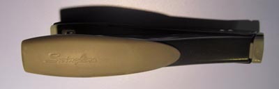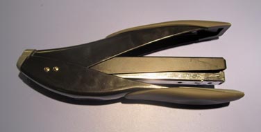 The Swingline SmartTouch is one of the ergonomically designed staplers that look odd. You can sit it on a table top like a standard stapler, but it’s more meant held and used in one hand off table. It has a rubber “comfort” grip with a finger indention on the “bottom” that gives you a solid squeeze grip. The front-loading staple magazine seems to float between the handle and the anvil (striker plate).