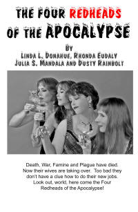 Our Four Author Series/Franchise – whichever you want to call it. Our characters were socialites of a sort in their times. They married the Horsemen of the Apocalypse – who then died in a tragically stupid ice fishing accident. We inherited their jobs. We are completely inept, and these are our adventures.