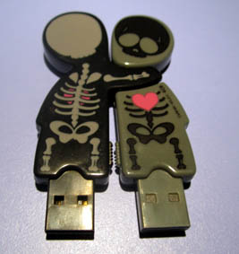 While at a 20% off anything you can get in the bag sale at Staples, we found these awesome ShareBytes 4GB companion flash/USB drives (thumb drive, call ’em what you will). Along with rubber ducks, I seem to have a burgeoning skull collection thanks to the Redheads of the Apocalypse series. So seeing the gray/black skeleton USB drives hugging and cute hearts…and I do think they may have been on further sale…even my husband said we had to get them.