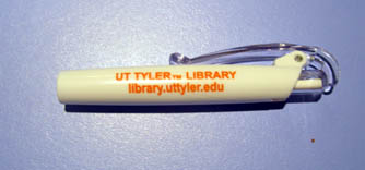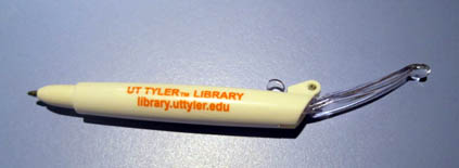 This past weekend, I participated in The East Texas Book Festival. I’ll be talking more about that on Wednesday, but in the goodie bag they gave everyone was a promotional pen from the major sponsor, UT Tyler Library. I don’t even know what to call this thing to find it online. If anyone comes up with the style name, please let me know.