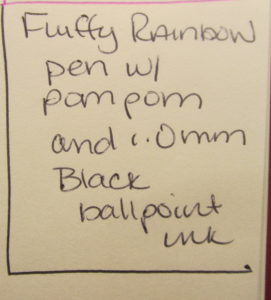Last week I put a photo on Facebook that got a lot of hits, but I haven’t done a review on it. It’s a Dollar Tree find that makes me happier than it should – it’s a furry, rainbow pom pom ballpoint pen. It’s totally ridiculous – which is what makes it wonderful.