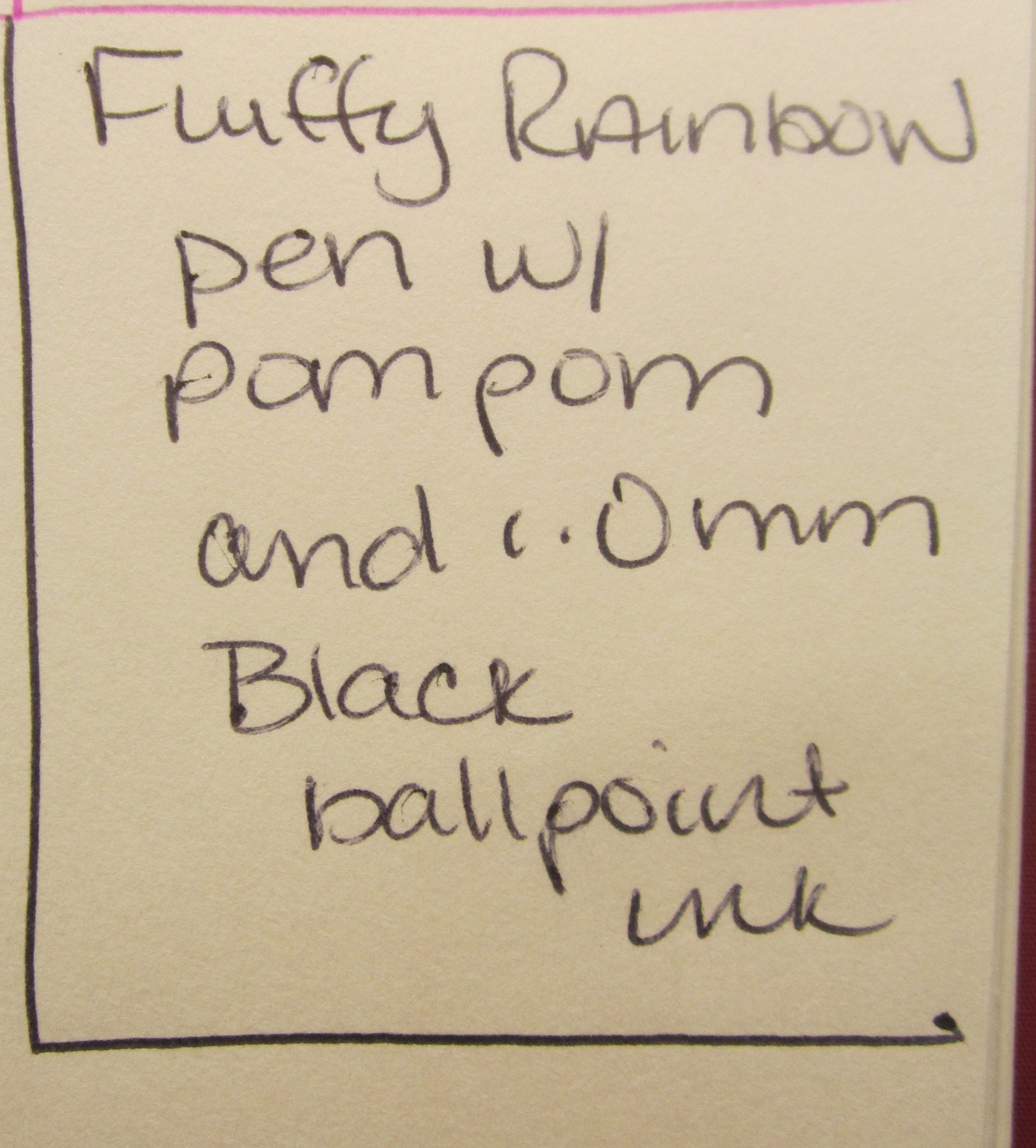 The drawback? The pom ball at the top. Makes it difficult to get into a pen case. That thing takes up space. There is a cap, but it’s sitting on my desk and no where near the pen, since it would be impossible to post it anywhere. The upside? It was $1 near the cash register at Dollar Tree.