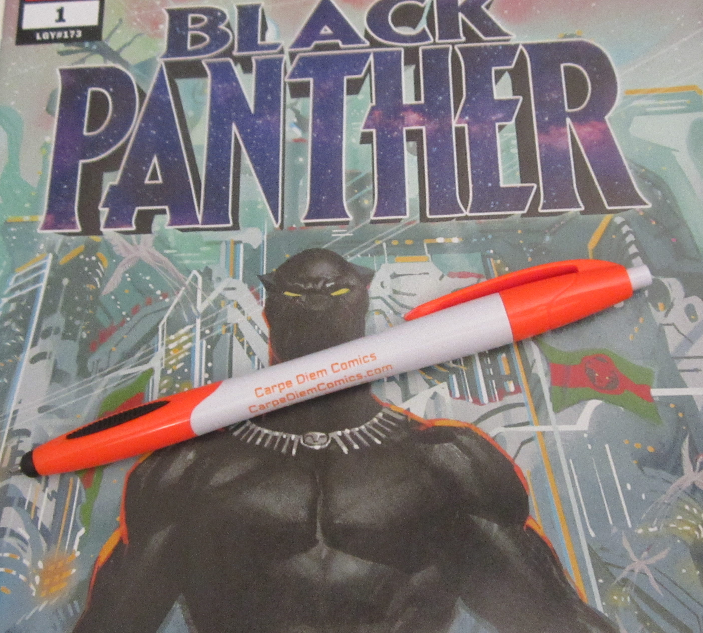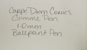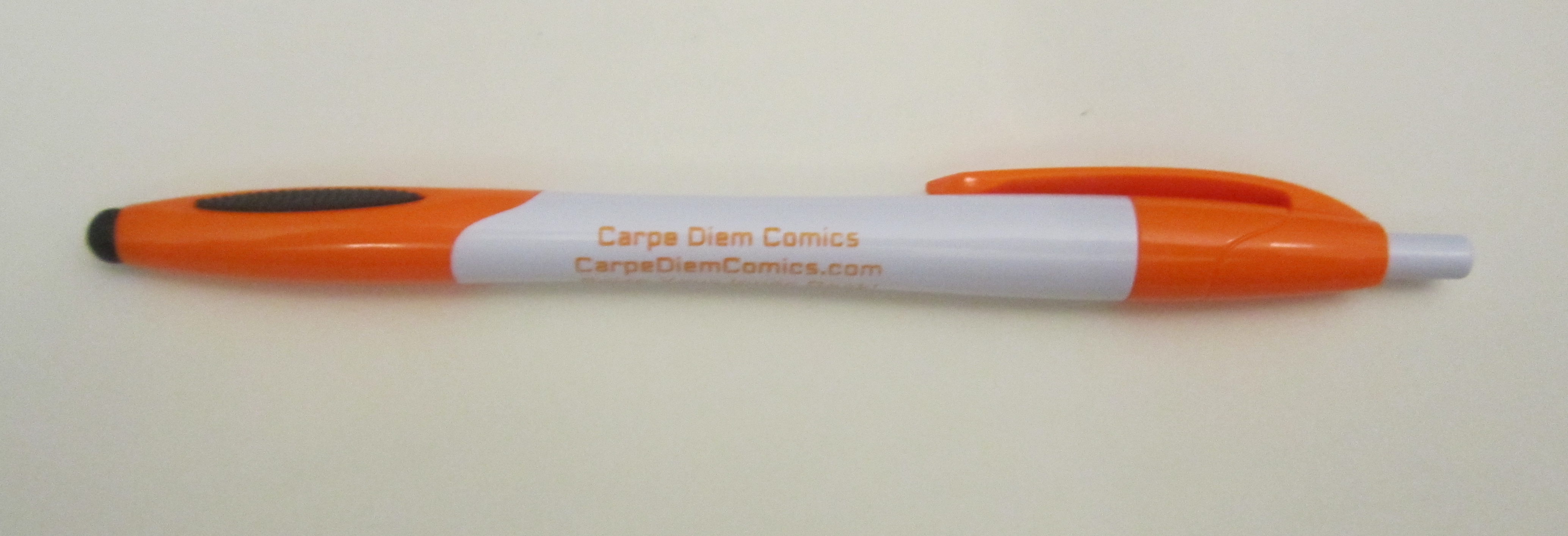 This past weekend my friends, Lys and Shado Wiley, realized a dream. They opened a comic book shop in McKinney, Texas – Carpe Diem Comics*. While they were building, and now that the shop is open, they did an inexpensive gimme pen for promotional purposes. They are smart people who take note of what others have done before them and picked a promotional pen with a stylus for people to use on their (and other) screens. It’s a smart move.
