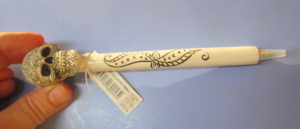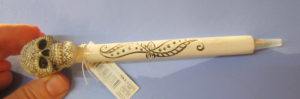 This is much like the black polymer skull pen that I reviewed last year, but this is a white, carved sugar skull pen. This sucker is super heavy duty. It’s not your basic cheap plastic. It’s a solid polymer – maybe clay? It’s not stone, but has a heft like stone. The skull is molded with the barrel, so you’d break something (like a bone) if you broke it off. If you NEEDED a pen that also worked as a weapon, this one would do some damage as a sap. BUT, because of the sugar skull carvings it would leave distinctive marks, so maybe let’s not do that.