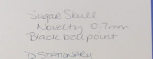 The ink is a fine point black ball point ink with a stainless steel point. The ink flows well and has a smooth action. The diameter of the barrel is minutely tapered and relatively comfortable if you’re okay with the overall weight. It’s about 6″ long, so it’s long enough to be comfortable. It’s a bit top heavy with the skull top.