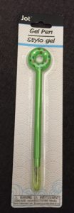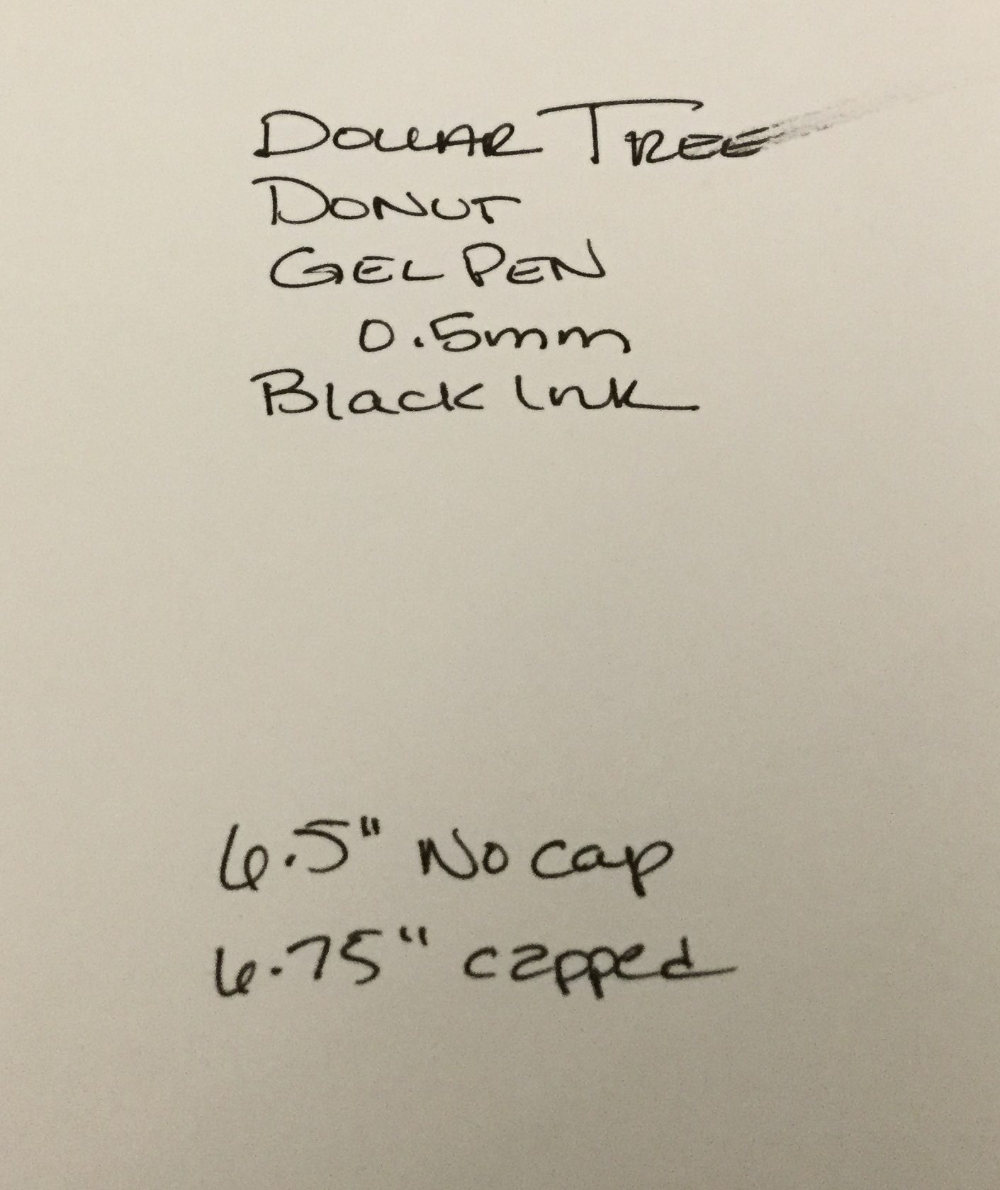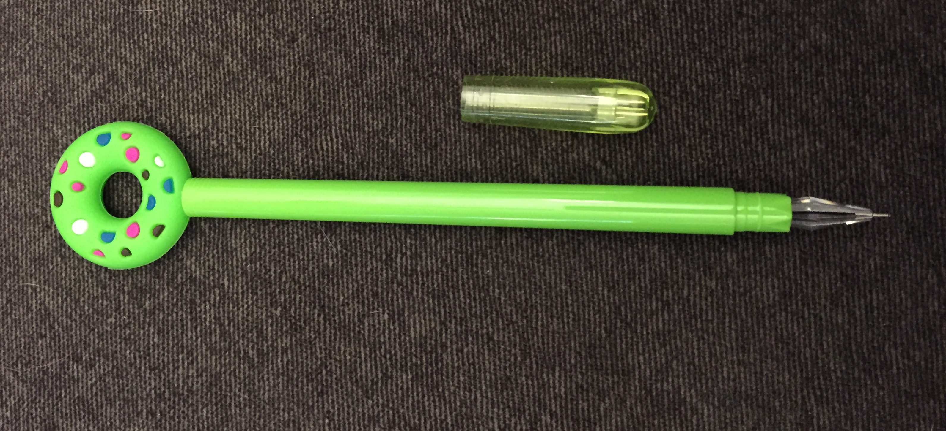 Not only is this just a silly fun pen, it is also a fine point gel pen – not more than 0.5mm, MAYBE a bit finer like a 0.4mm, but the package doesn’t say. It is a needle point with a faceted, clear plastic guard. It’s about 6.5†long, which makes it long enough to be comfortable. It’s fairly comfortable, but top heavy with the cute, sprinkle-endowed donut cap. It’s a completely smooth barrel with an edge before the faceted grip – so there are edges that can bite into fingers. It’s not a long-term writing pen.