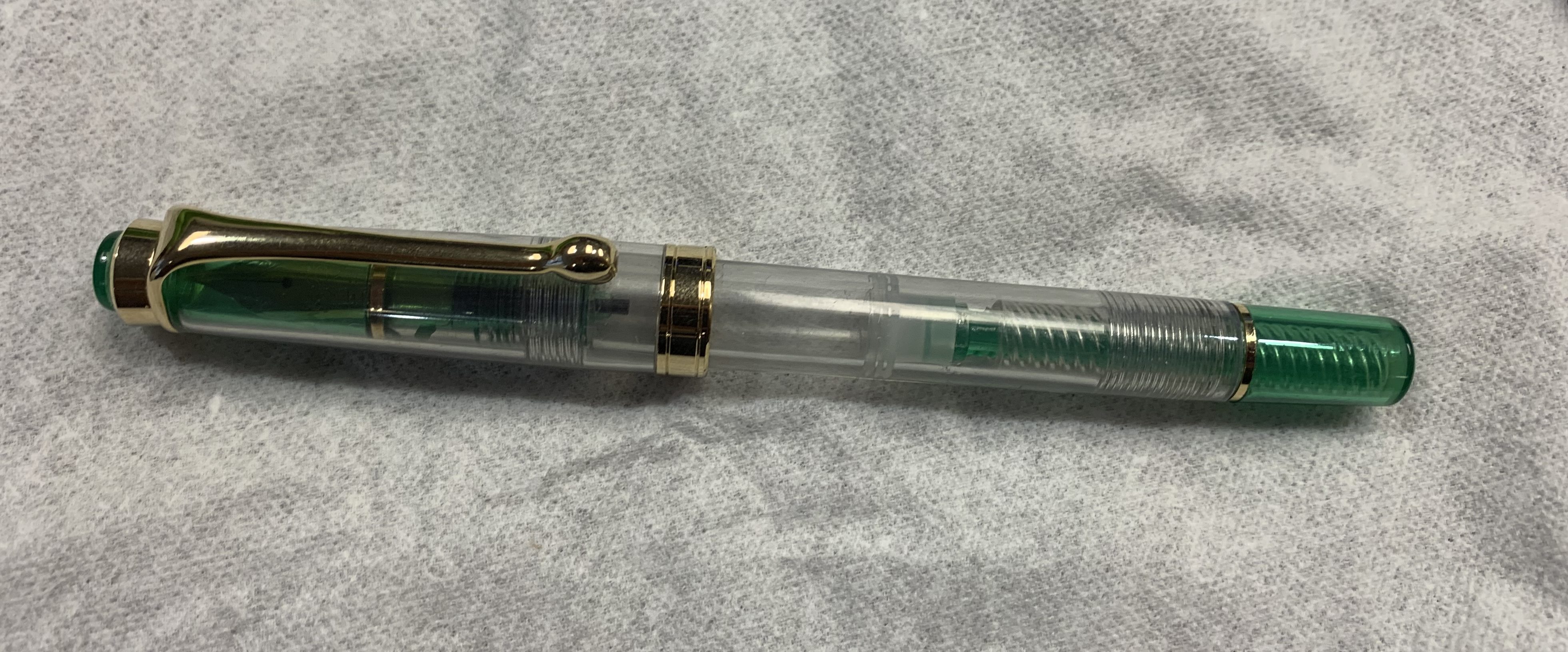 We talked to Lucas from Scribal Workshop. Walked the show. Like I said, it was tight and crowded and it started to trigger some of my crowd claustrophobia. I also wasn’t feeling great. (I had a weird combo of severe allergies and maybe con crud for the last week.) So I wasn’t as tempted to linger as I might’ve been. On the way back out I found my “ah ha!” place – a buy one/get one free place. I got two demonstrators – a black and clear that has an interesting yellow fade on it. And a green and clear with gold accents.