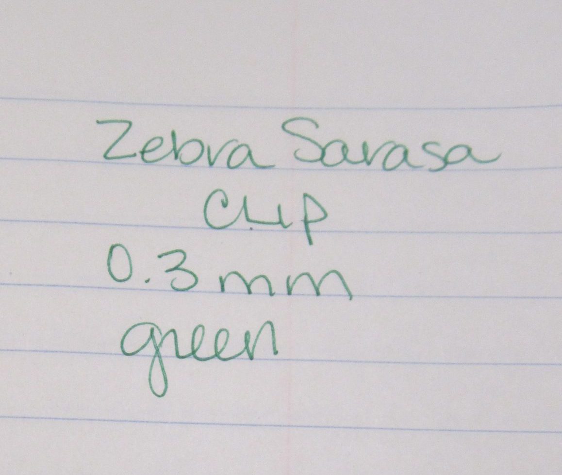 The Sarasa Clip has a great green gel ink. This one comes in the 0.3mm point with a metal, cone tip. This pen has a clear plastic, demonstrator-type barrel with a green plastic plunger and clip. The barrel threading is on the inside, making the barrel smooth and ridgeless. The green rubber grip gives the pen extra comfort in long use. The ink is smooth and doesn’t smear much. It writes quite well. It’s refillable with the Zebra JF-0.3 Sarasa Gel Refill. This is a water-based ink but is fade resistant. And the green ink is dark and rich for such a fine line. There’s no smearing, very little scratching, and it’s clear reading.